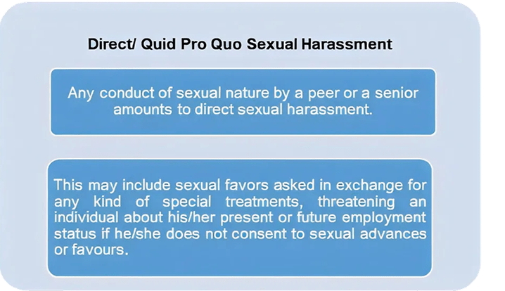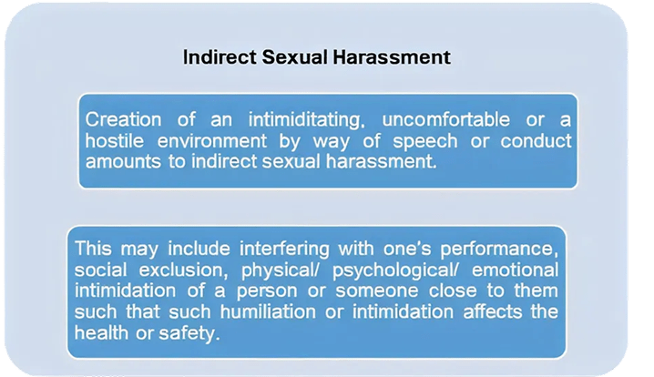Sexual Harassment means any unwelcome act or behavior of sexual nature, whether direct or by implication.
